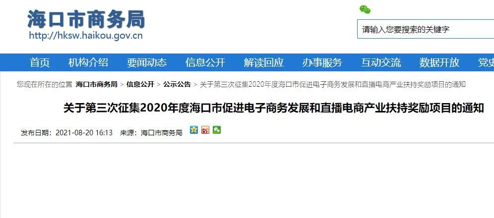 8月20日??谑猩虅站钟“l(fā)通知,面向社會公開征集:2020年度??谑写龠M電子商務發(fā)展扶持項目、2020年度??谑兄С职l(fā)展直播電商產(chǎn)業(yè)扶持獎勵項目。符合條件的相關企業(yè)及機構、個人按照有關要求申報。